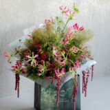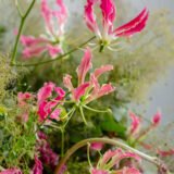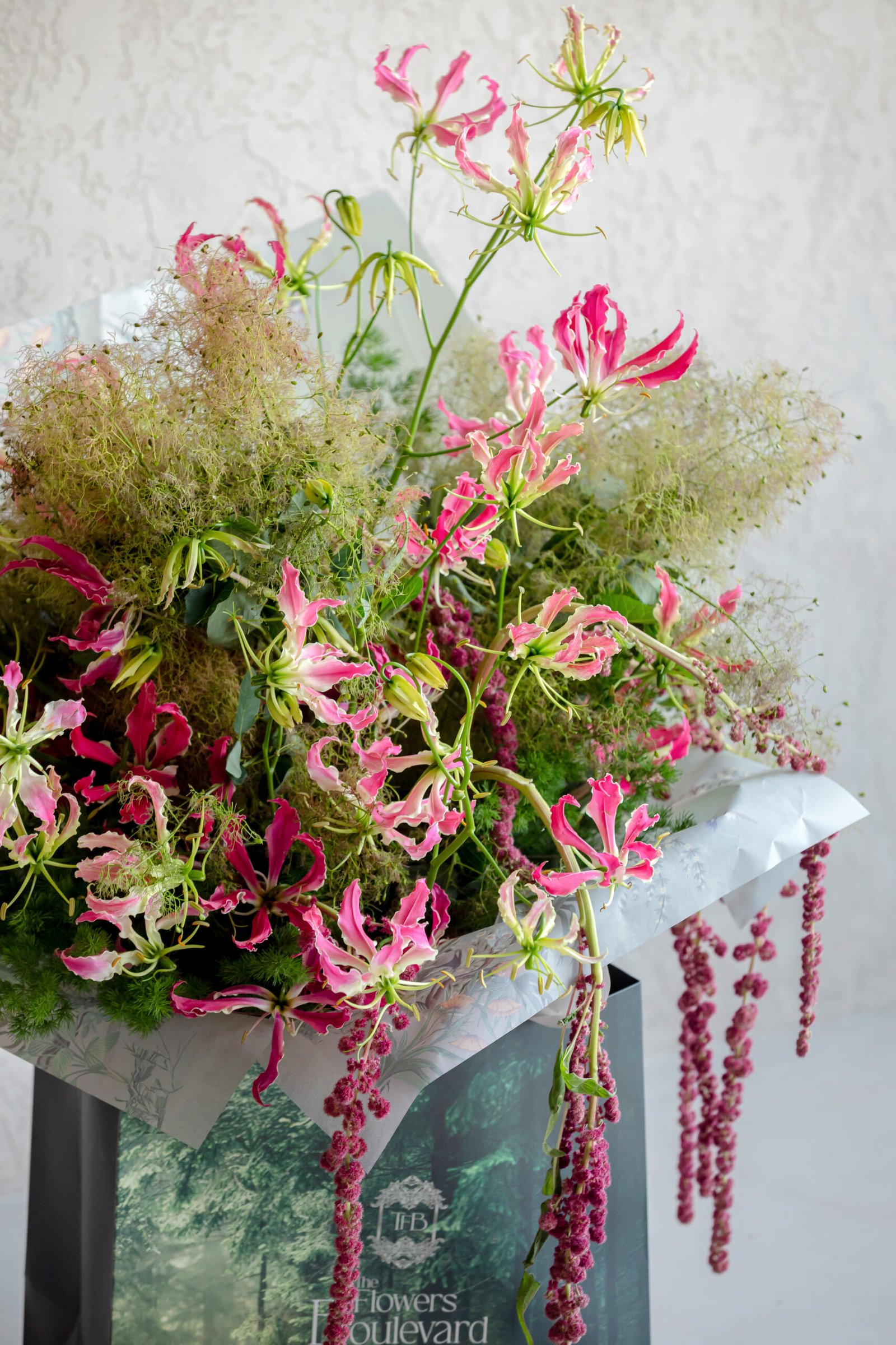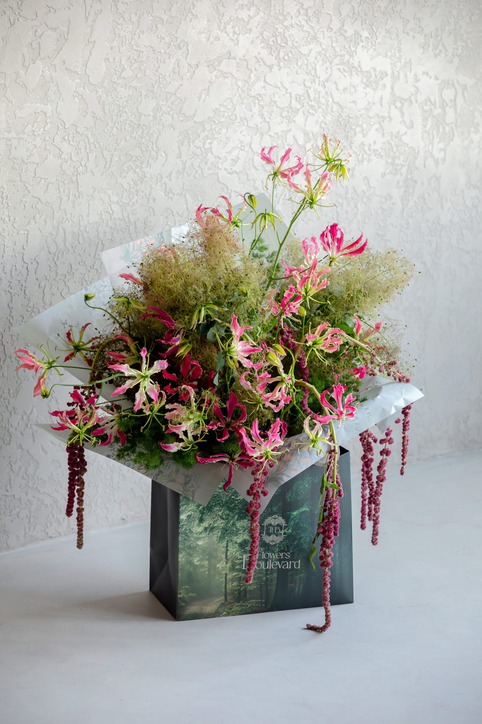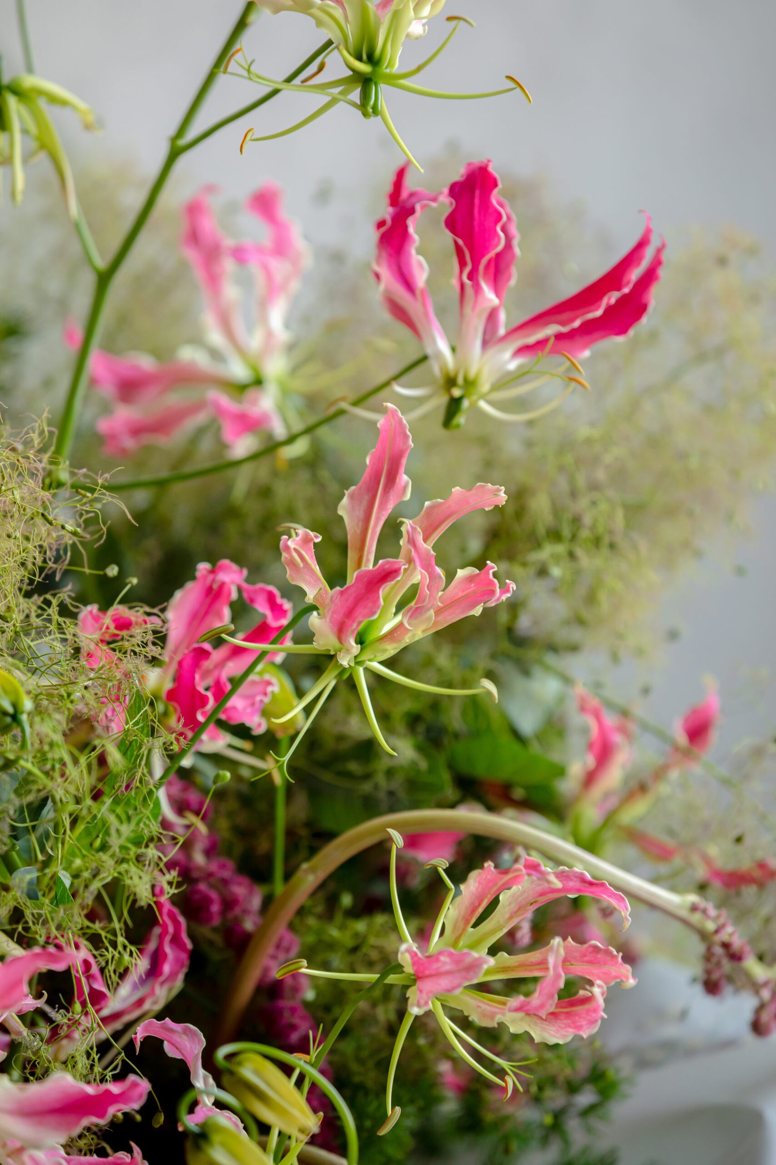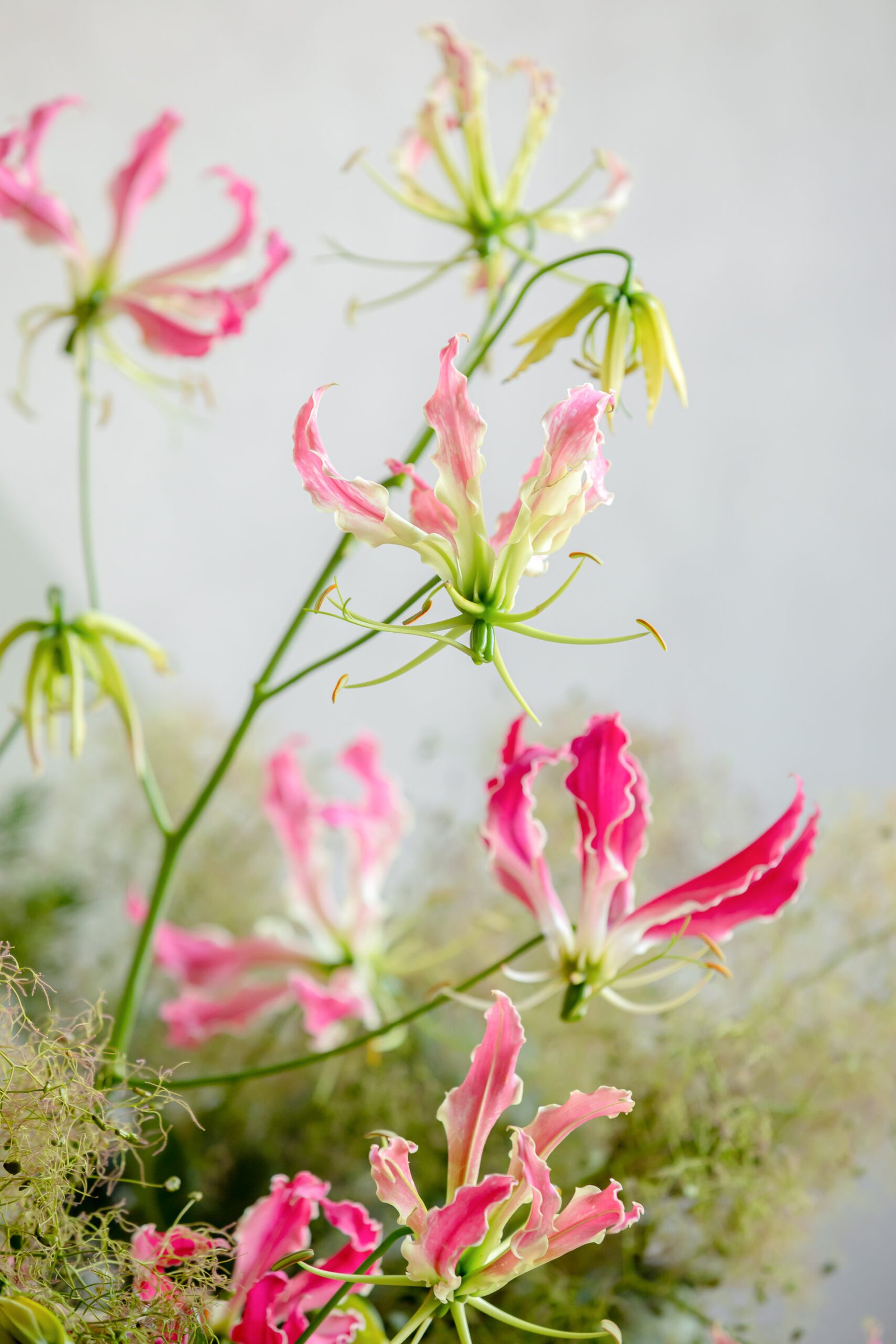 A touch of the wild fiery gloriosa and lush greens in a rustic ceramic vase, capturing nature’s free-spirited elegance.